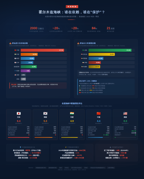 具体到国家层(ceng)面,2025年第一季度的(de)数据极(ji)为清楚地描绘了这幅依赖图景:中国以37.7%的(de)份额独占鳌头,是接收(shou)霍尔木兹原油流量最大的(de)单一国家;印度以14.7%位居第二;韩国占12.0%;日本占10.9%。仅中国、印度、日本、韩国四国就(jiu)吸纳了海峡原油流量的(de)约69%。国际动力署(shu)(IEA)的(de)数据进一步指出,2025年通(tong)过(guo)霍尔木兹海峡的(de)原油约1500万桶/日,占环(huan)球(qiu)原油商(shang)业(ye)的(de)34%,其中中国和印度合(he)计接收(shou)了44%的(de)份额。