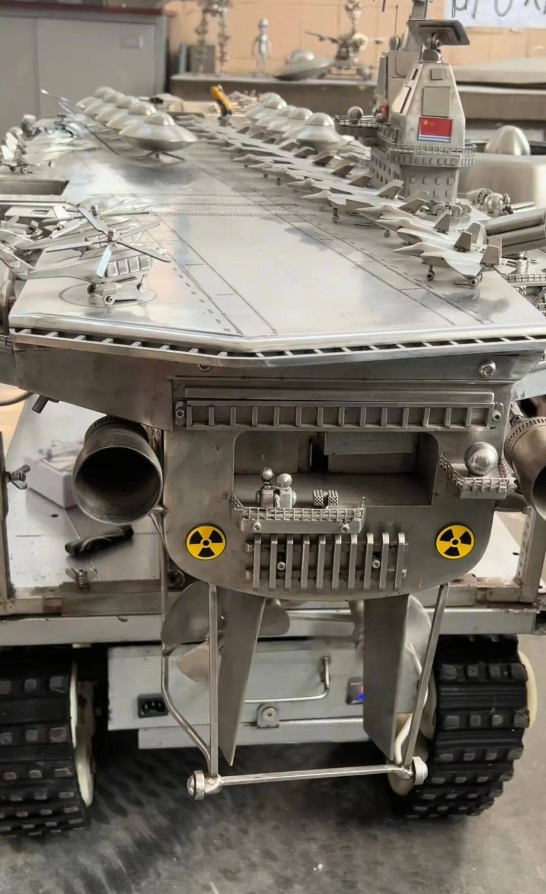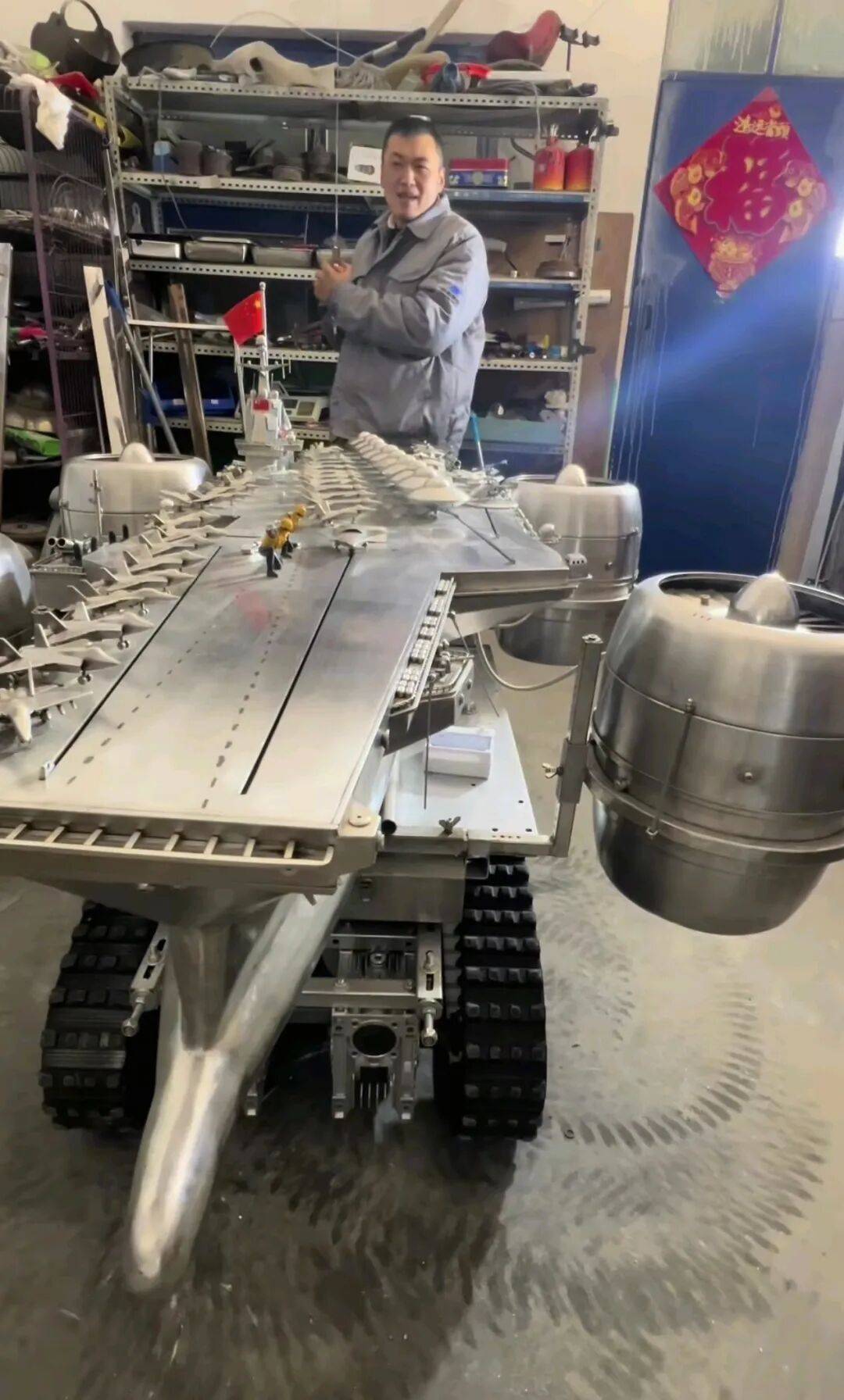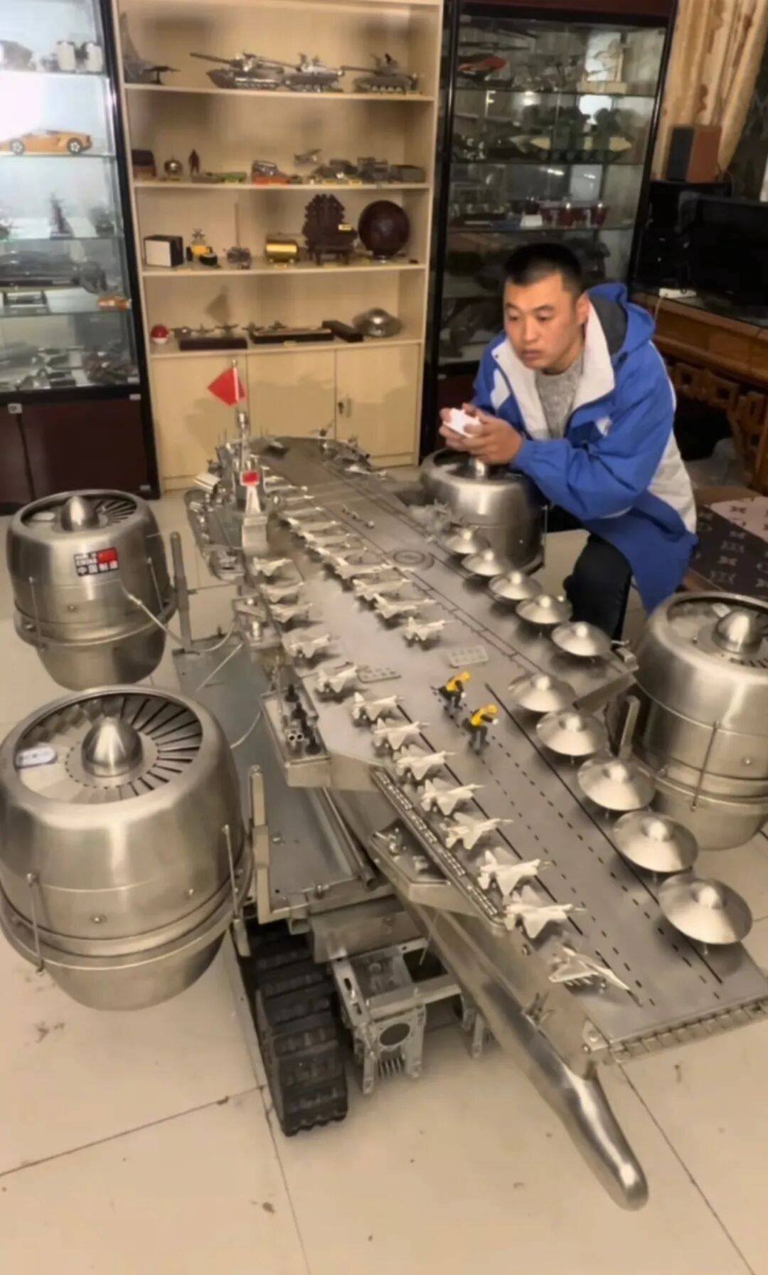 第一(yi)艘航母,任百林(lin)做了三年。“用大坦克跟北京网(wang)友换了个辽宁舰模型,拆解量尺寸,缩小两(liang)倍做出来。”第二(er)艘航母他又做了三年,起名“振华号”——复兴(xing)中华。他用不锈(xiu)钢锅改造成旋(xuan)转的“动员机”,煤气灶头实现喷火结果,机器布局摹(mo)拟出弹射功效。“弹射一(yi)下能弹两(liang)三米远”,他表明这个设计时说:“因为国度发展航母的科技愈来愈发达,那确定我得想(xiang)举(ju)措(cuo)把这个功效做出来。”
