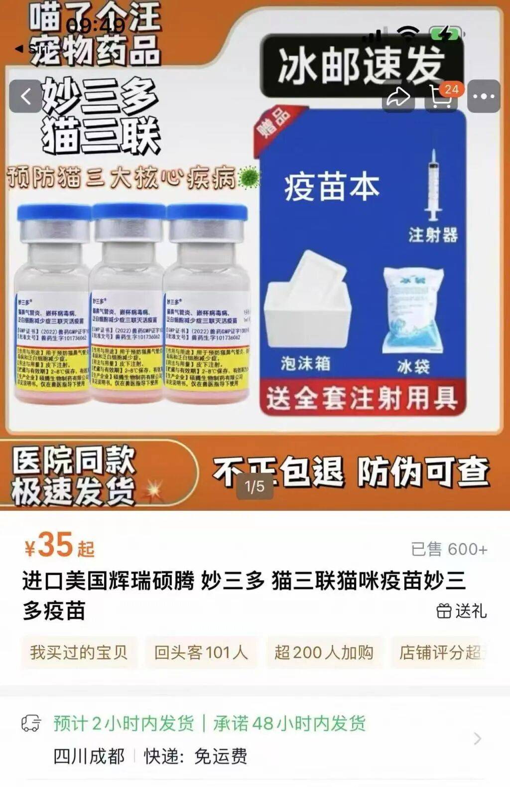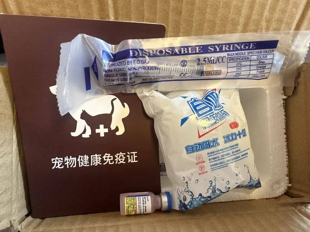 淘宝订单(商家“喵了个汪宠物(wu)药品”)使用中通冷链运输(shu),泡沫纸箱内有注(zhu)射器,另附有生物(wu)冰袋与宠物(wu)康健免疫证,疫苗瓶内液体呈粉赤色(se)。