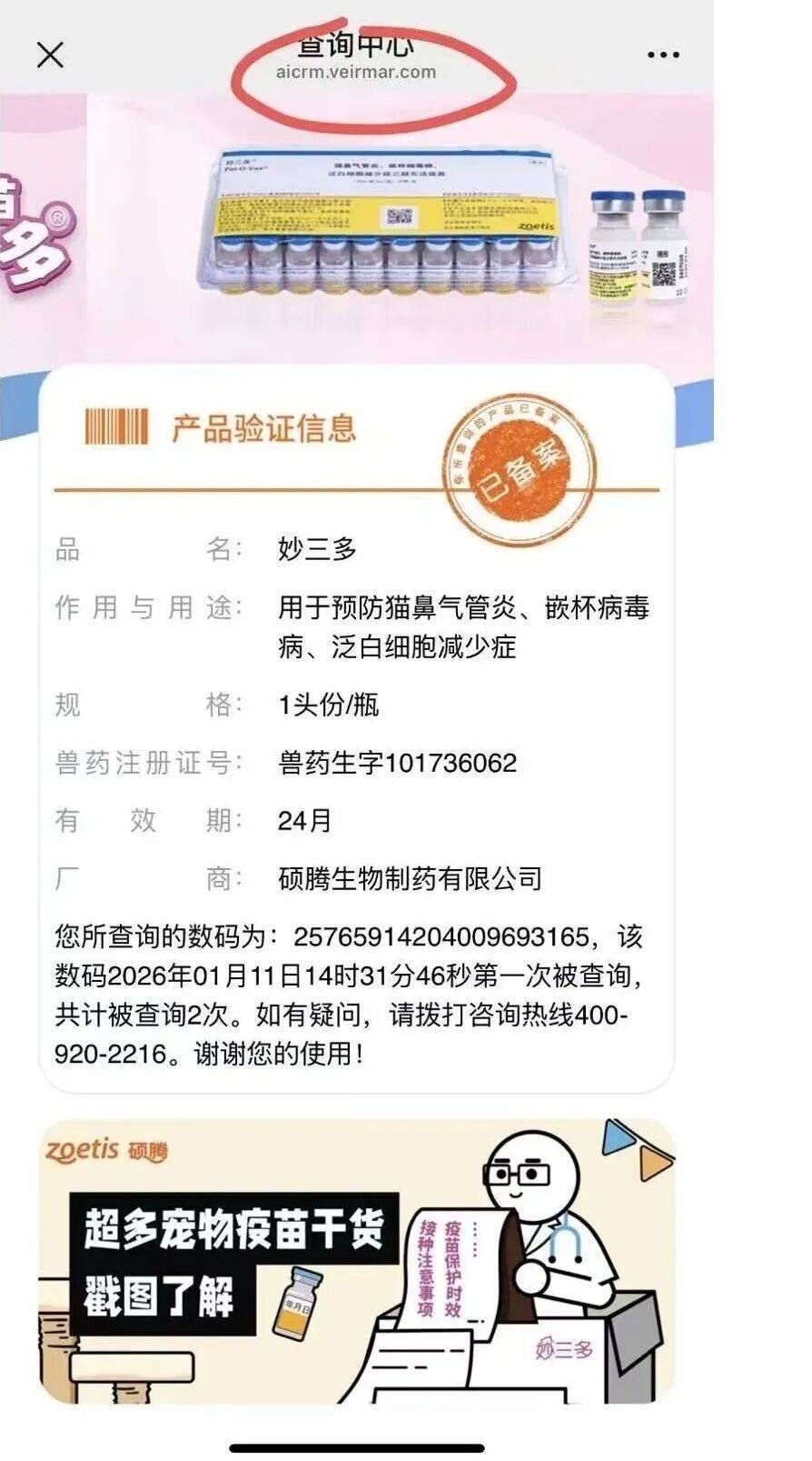 上述(shu)三款网(wang)购的疫苗,通过瓶子外包(bao)装扫码,页面均显示硕腾产品考证信息的页面,其中包(bao)括品名、兽药注(zhu)册(ce)证号、厂商和查询数码等相干信息。单从检验(yan)页面上看不出直接问题。